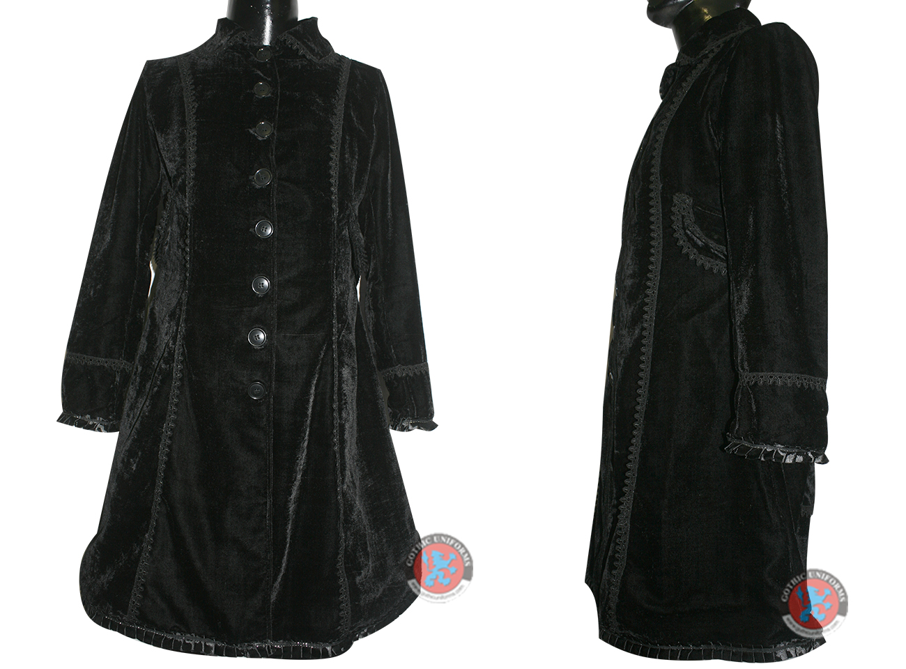 Black Color Velvet Ladies Long Coat with embroidery lace and Ribbon on bottom.